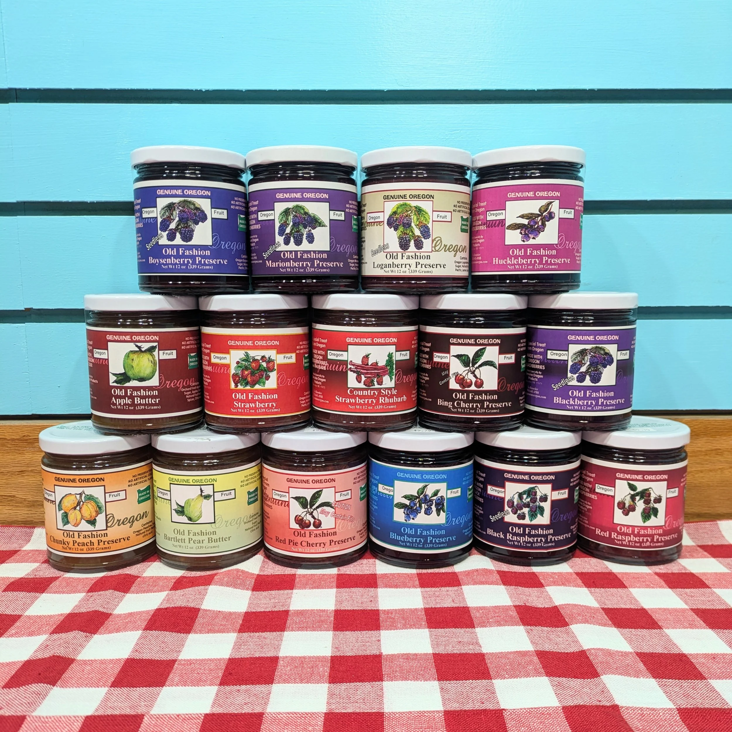 Shop › Jam/Preserves - Genuine Oregon Image 1 of 1 Jam/Preserves - Genuine Oregon from $11.00 Jam made in Oregon. 12 oz Flavor: Select Flavor Apple Butter Bartlett Pear Butter Bing Cherry Blackberry (Seedless) Black Raspberry (Seedless) Blueberry Boysenberry (Seedless) Chunky Peach Elderberry Huckleberry Kotata Berry Loganberry (Seedless) Marionberry Marionberry (Seedless) Red Raspberry Strawberry Strawberry Rhubarb Quantity: Add To Cart Added! Jam made in Oregon. 12 oz